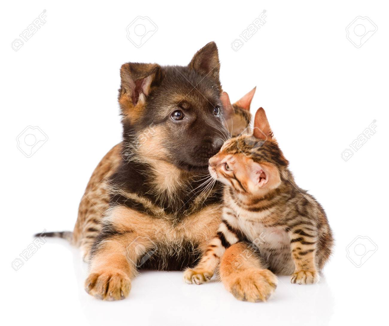 Chiot Berger Allemand étreindre Chatons Bengale Isolé Sur Fond Blanc