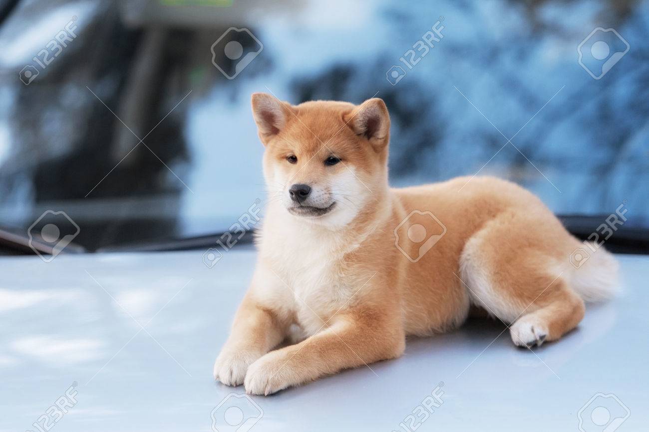 Beautiful Young Red Shiba Inu Puppy Dog On Car In Outdoor